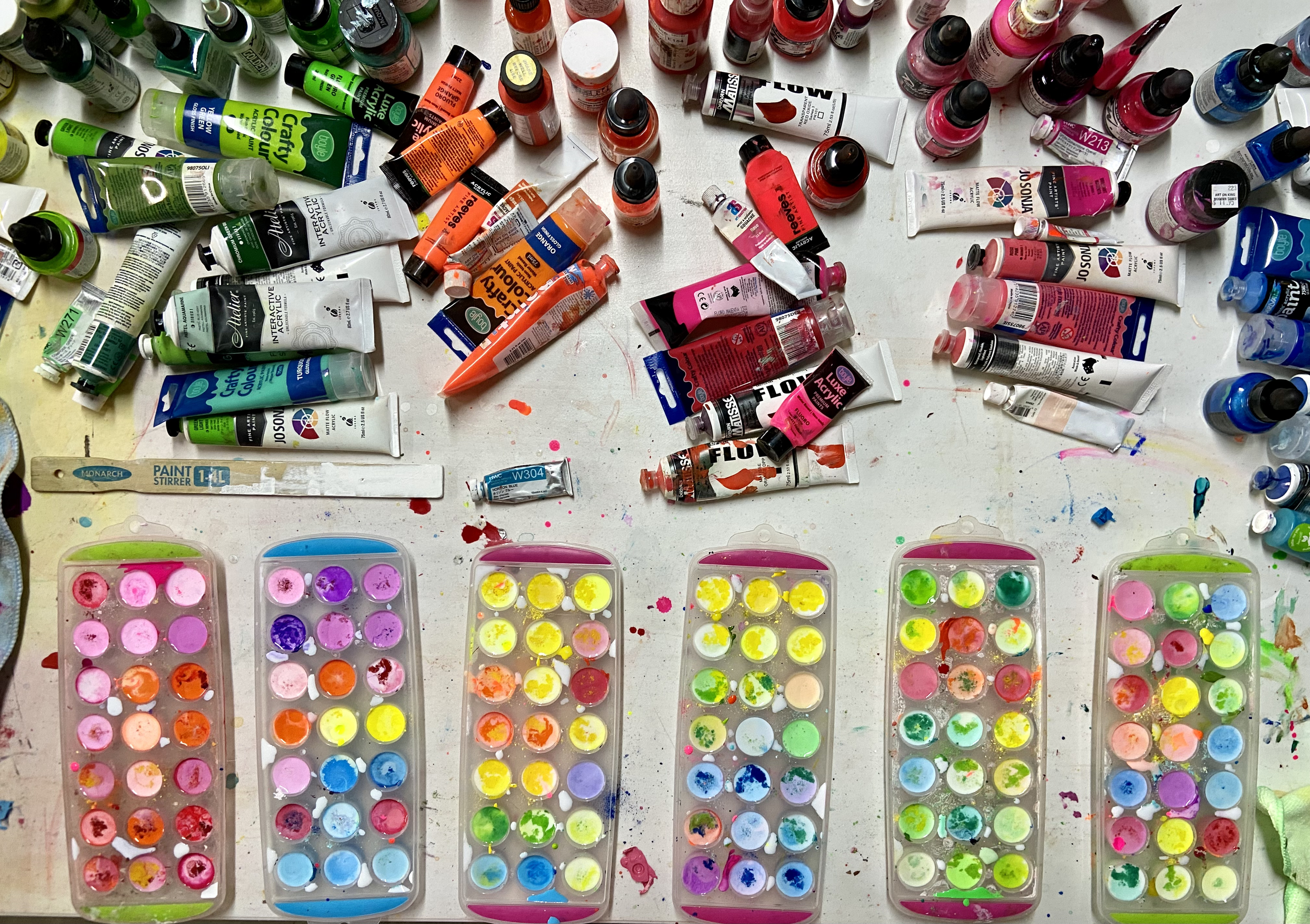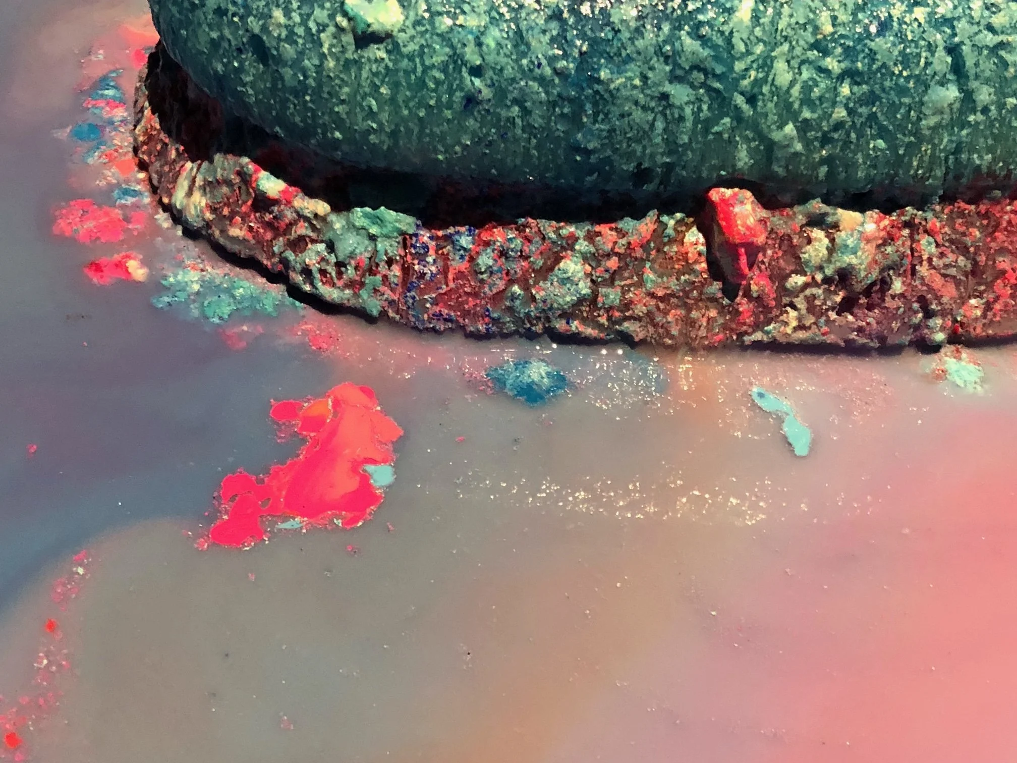 Ice Works are process-driven works utilising melted frozen pigments. Ice Works are both permanent works on paper and canvas, and ephemeral works activated within the environment. The process sees a sizeable number of pigments, acrylic paints, dyes, inks and natural colours derived from nature, which are laid within water and frozen. The frozen blocks are then placed and manipulated into a semi-organic interactive painting. Ice Works are often immersive and participatory within the environment. Short films capture the melting moments - these videos are pieced together from stop motion works and user generated content from the audience, with participatory happenings the only evidence the pieces existed at all.